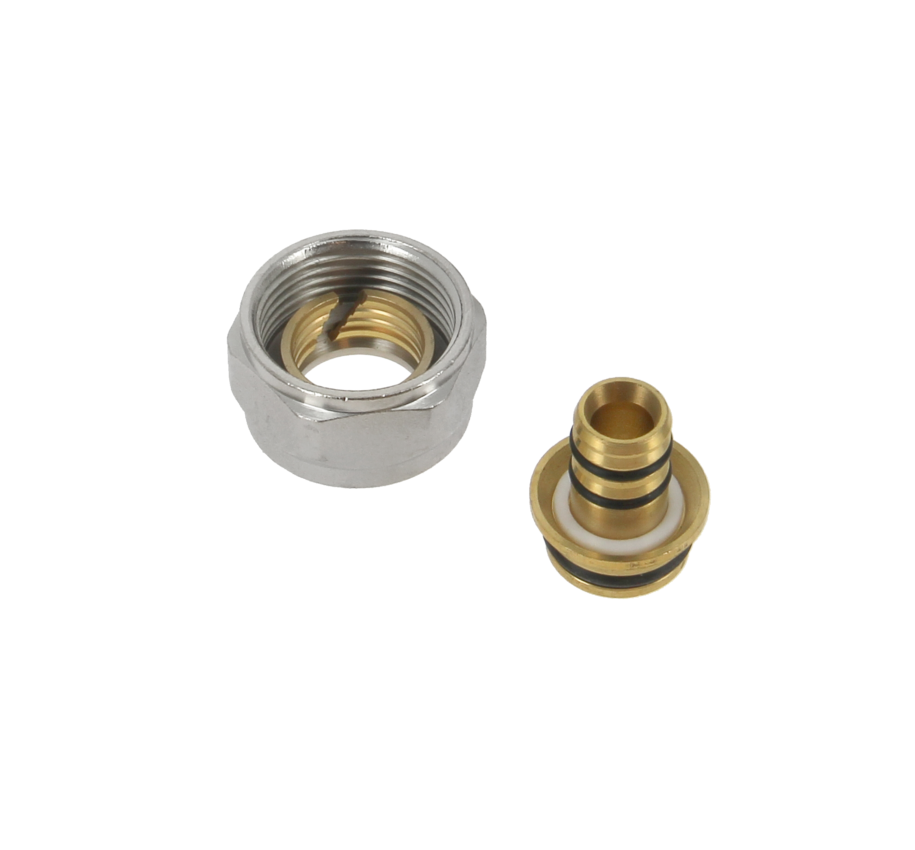 De knelfitting bestaat uit 3 delen: het huis (1), de knelring (2) en de wartelmoer (3). Deze wordt compleet gemonteerd geleverd om hem vervolgens op eenvoudige wijze aan te kunnen sluiten op de koperen buis.