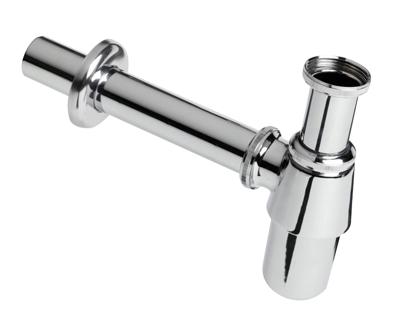 Bekersifon verchroomd. Met muurbuis en rozet.