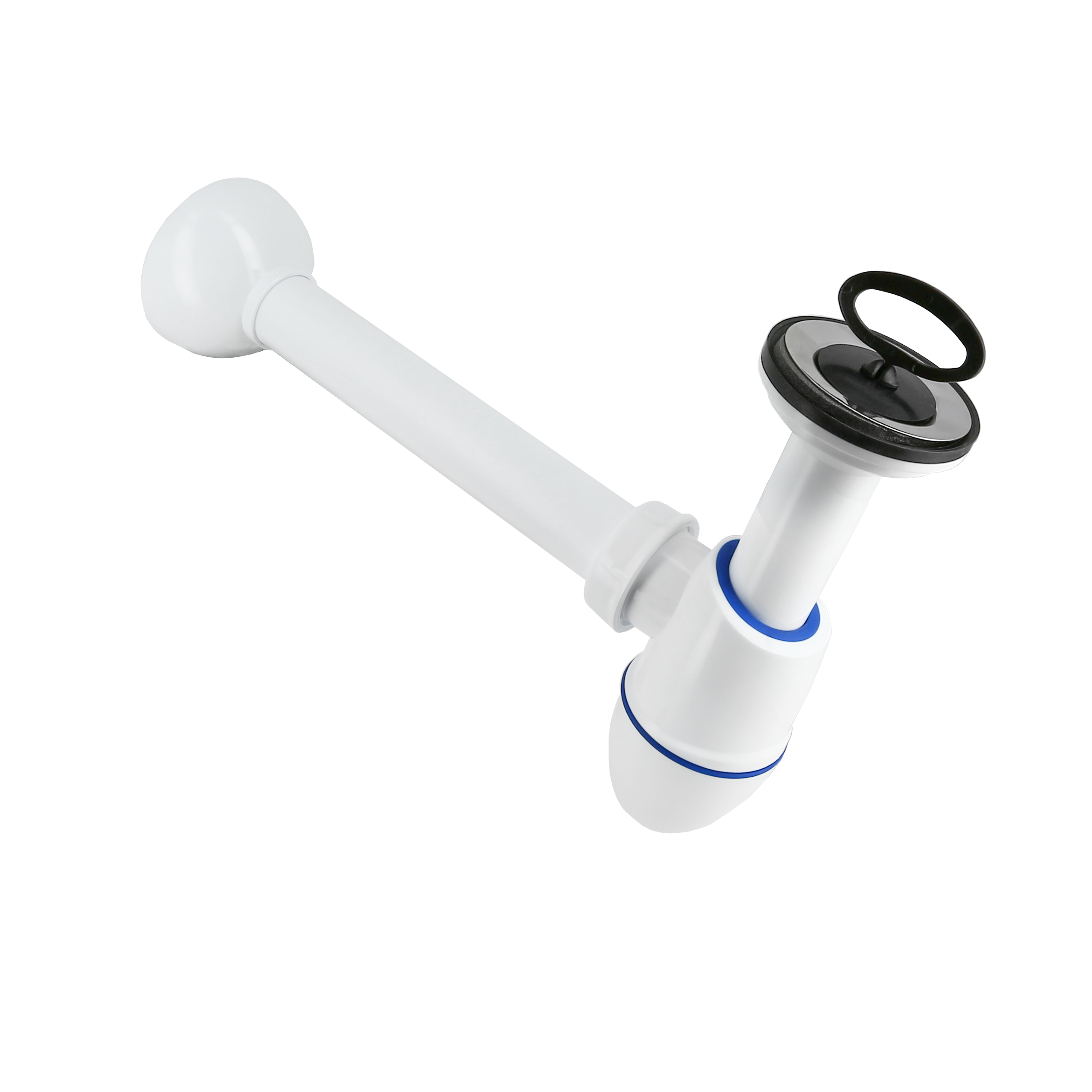 Plugbekersifon kunststof. Met muurbuis, rozet, rubber stop.