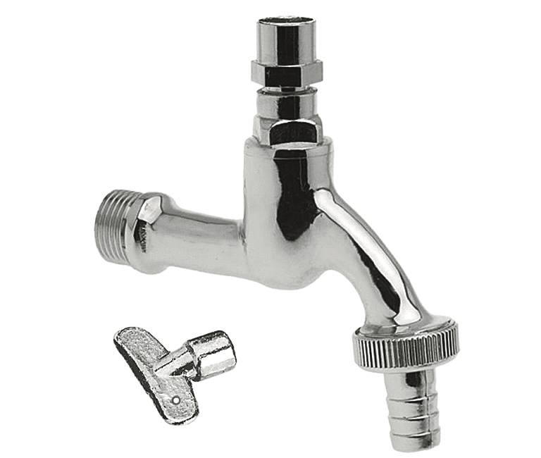 Sanitaire tapkraan met slangkoppeling ingericht voor sleutel. Gepolijst verchroomd.