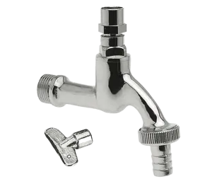 Sanitaire tapkraan met slangkoppeling ingericht voor sleutel. Gepolijst verchroomd.